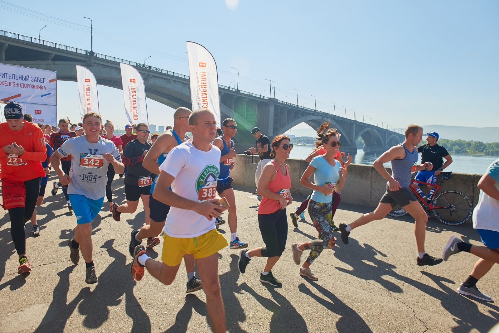Такой массовой разминки перед стартом на набережной Енисея не было давно. На участие в благотворительном забеге «Достигая цели», который организовали красноярские железнодорожники, зарегистрировались 600 человек! Здесь и простые горожане, и конечно, сами работники магистрали. Так, по-спортивному они отмечают свой профессиональный праздник — День железнодорожника.